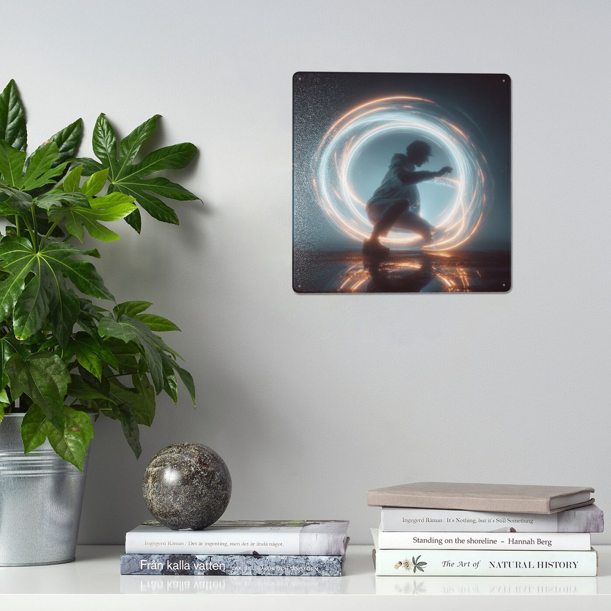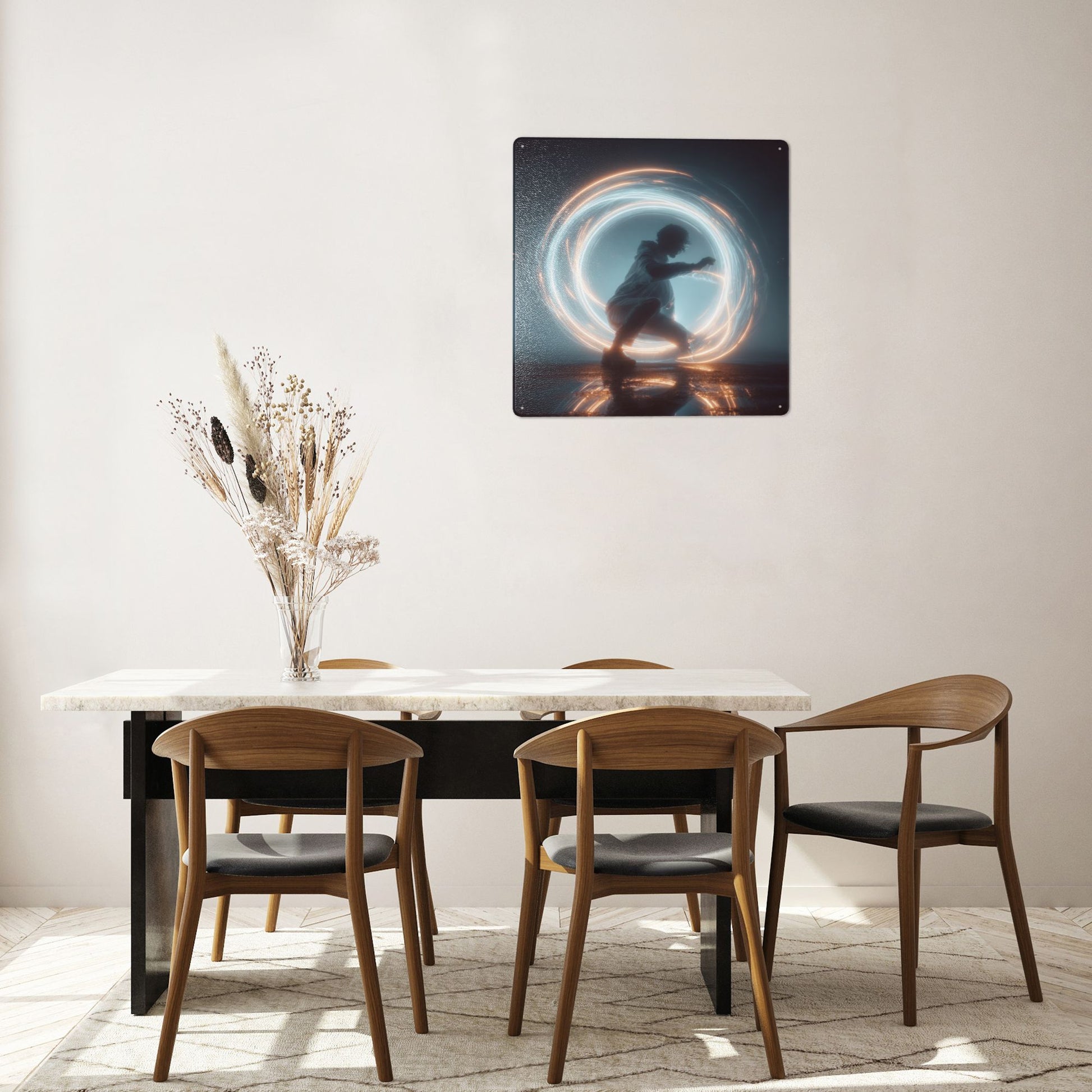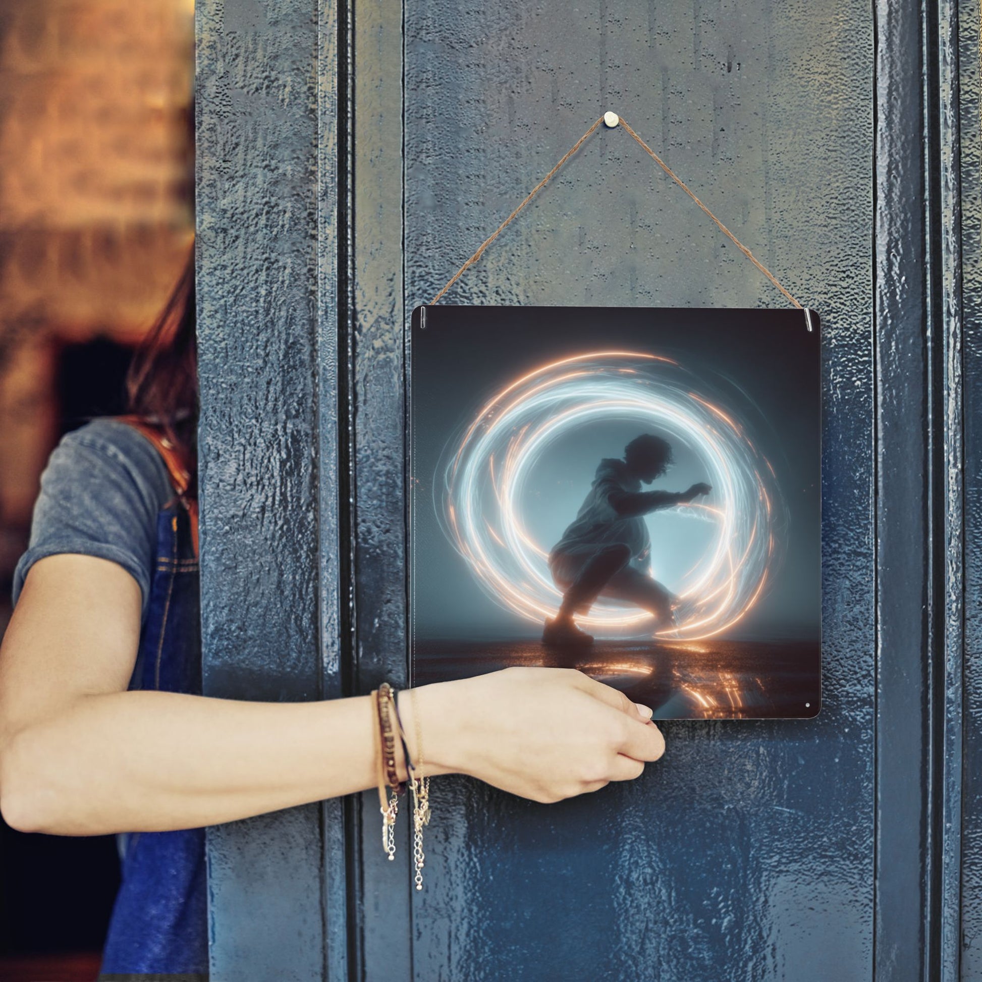Immerse your space in the kinetic power of light and motion with this mesmerizing 12"x12" tinplate wall art. A silhouetted figure crouches mid-scene, surrounded by swirling rings of light that blaze against a misty, darkened backdrop. The glowing loops feel electric, like a portal of energy, frozen in time — symbolizing inner power, transformation, and the surge of potential waiting to be unleashed.