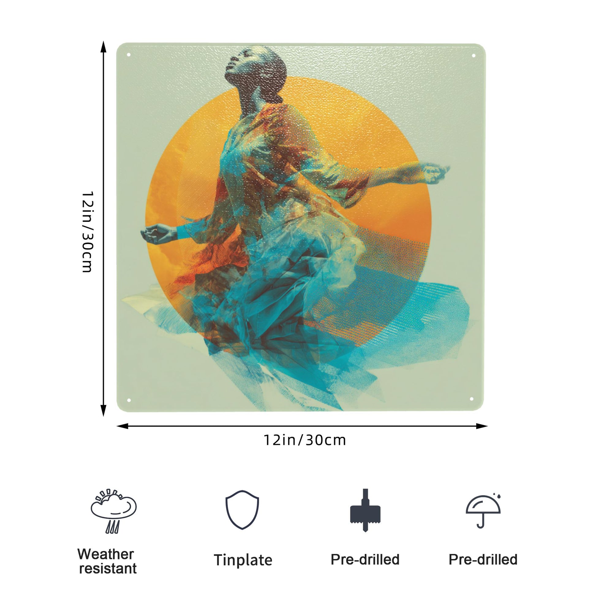 Bask in the radiant symbolism of freedom, grace, and inner strength with this stunning 12"x12" tinplate artwork. A woman, captured mid-movement, rises effortlessly within a glowing circular aura — her flowing blue gown dissolving into sheer ethereal waves. It’s as if she’s dancing between time and space, embraced by warmth and inner light.