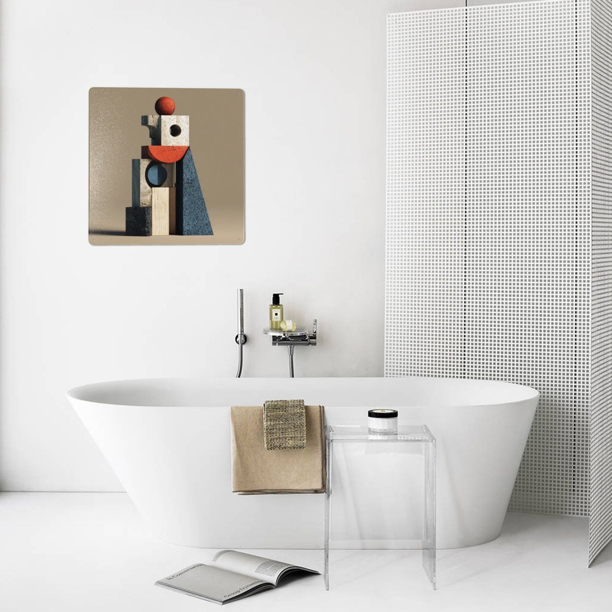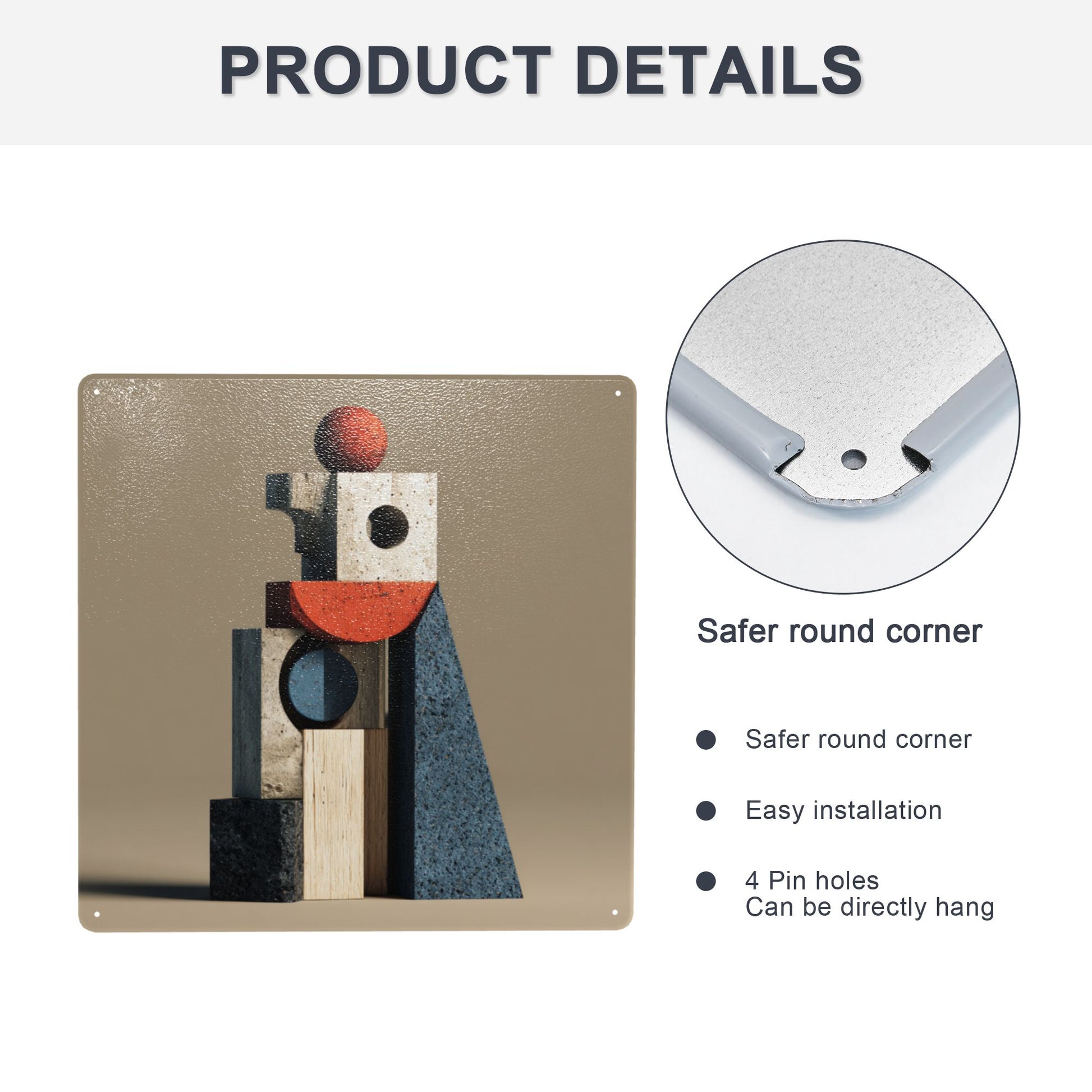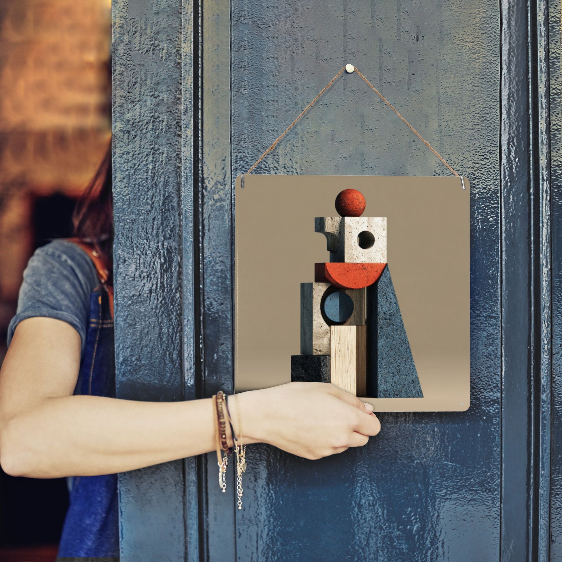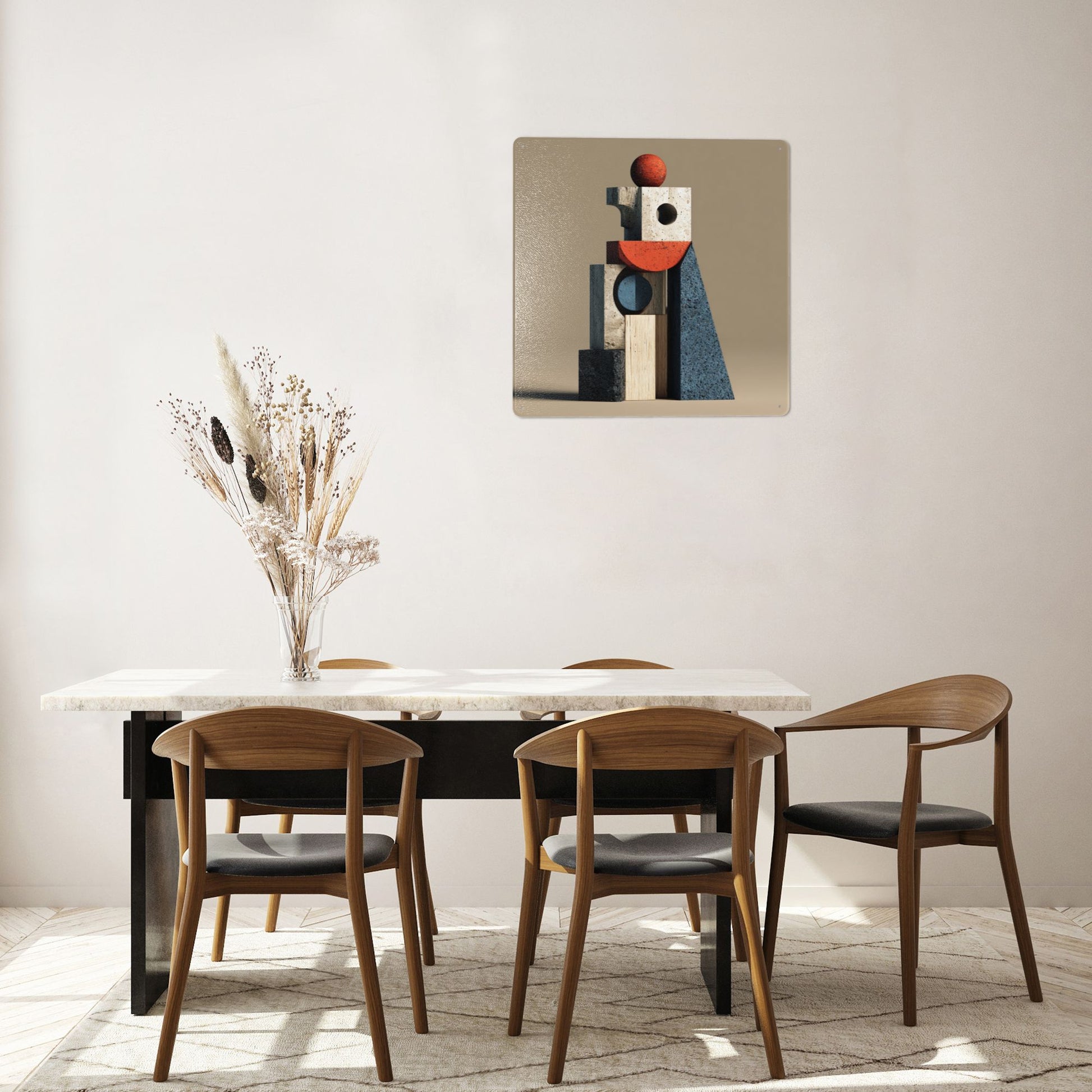 Add depth and dimension to your interior space with this bold 12"x12" geometric abstract wall sign. The composition features an arrangement of architectural shapes — cubes, spheres, cylinders, and trapezoids — presented with realistic textures that mimic concrete, wood, and stone. The carefully balanced mix of colors and shapes embodies minimalism, modernism, and structural balance in one powerful visual.