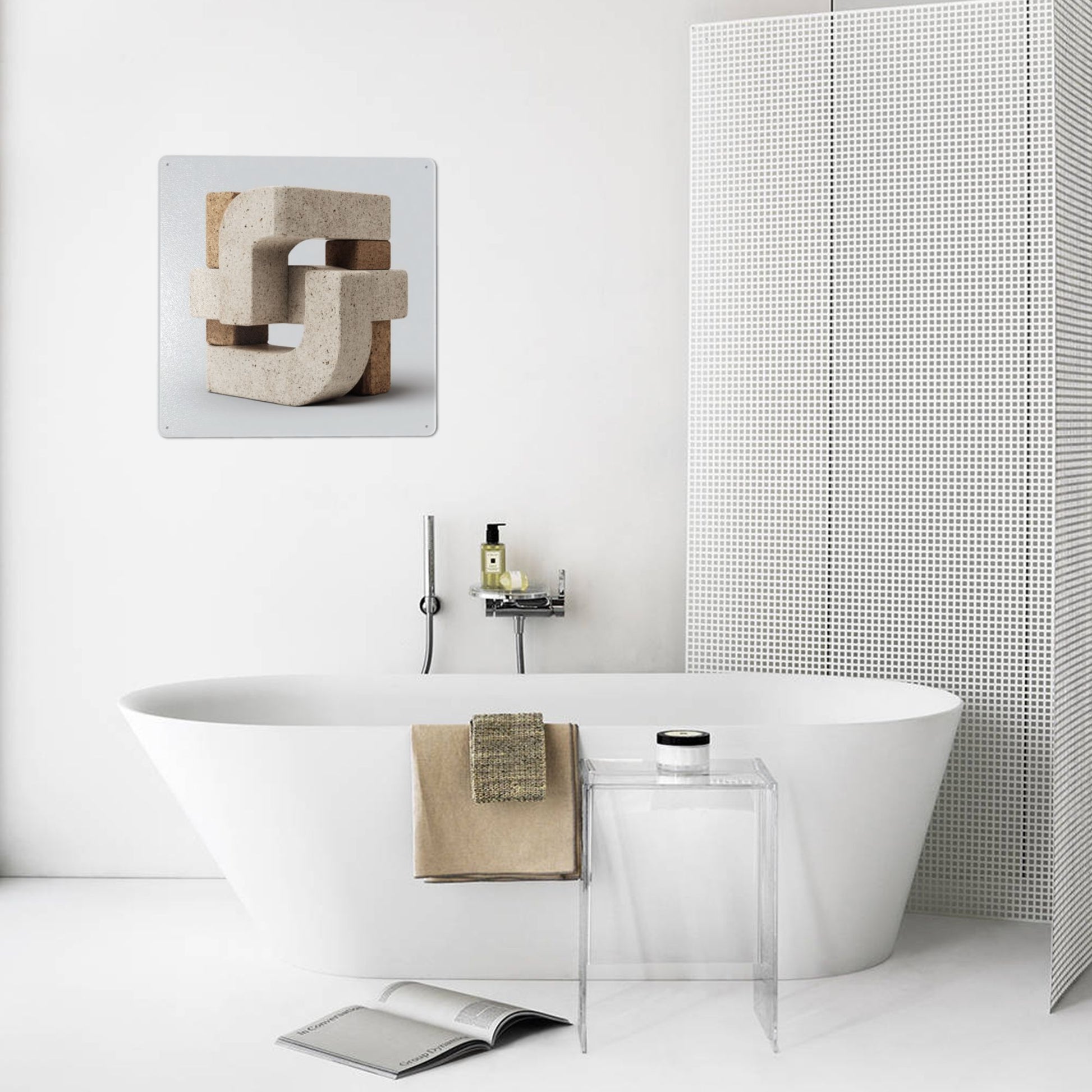 This 12"x12" abstract wall art captures a striking interplay of interlocked block forms — with cream, sand, and terracotta hues mimicking the textures of stone and clay. The arrangement of U-shaped and rectangular modules creates a three-dimensional effect that evokes architectural elements, minimalism, and modern industrial design all at once.