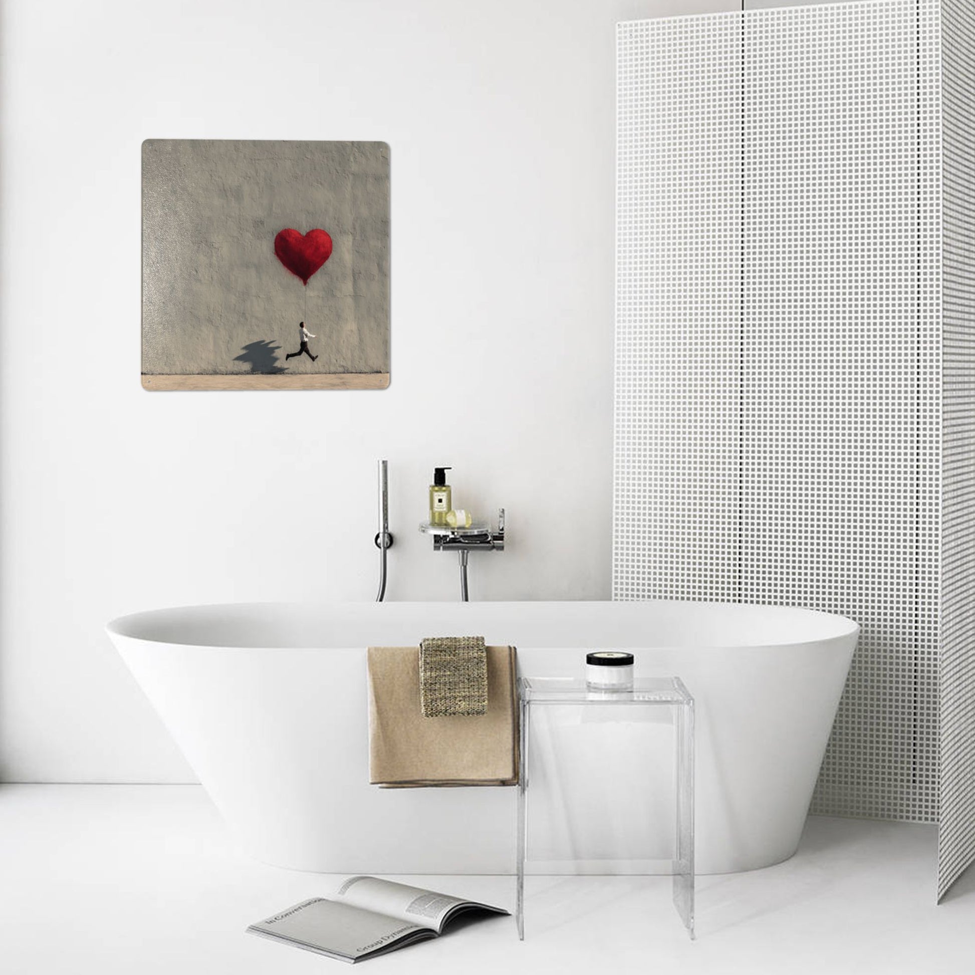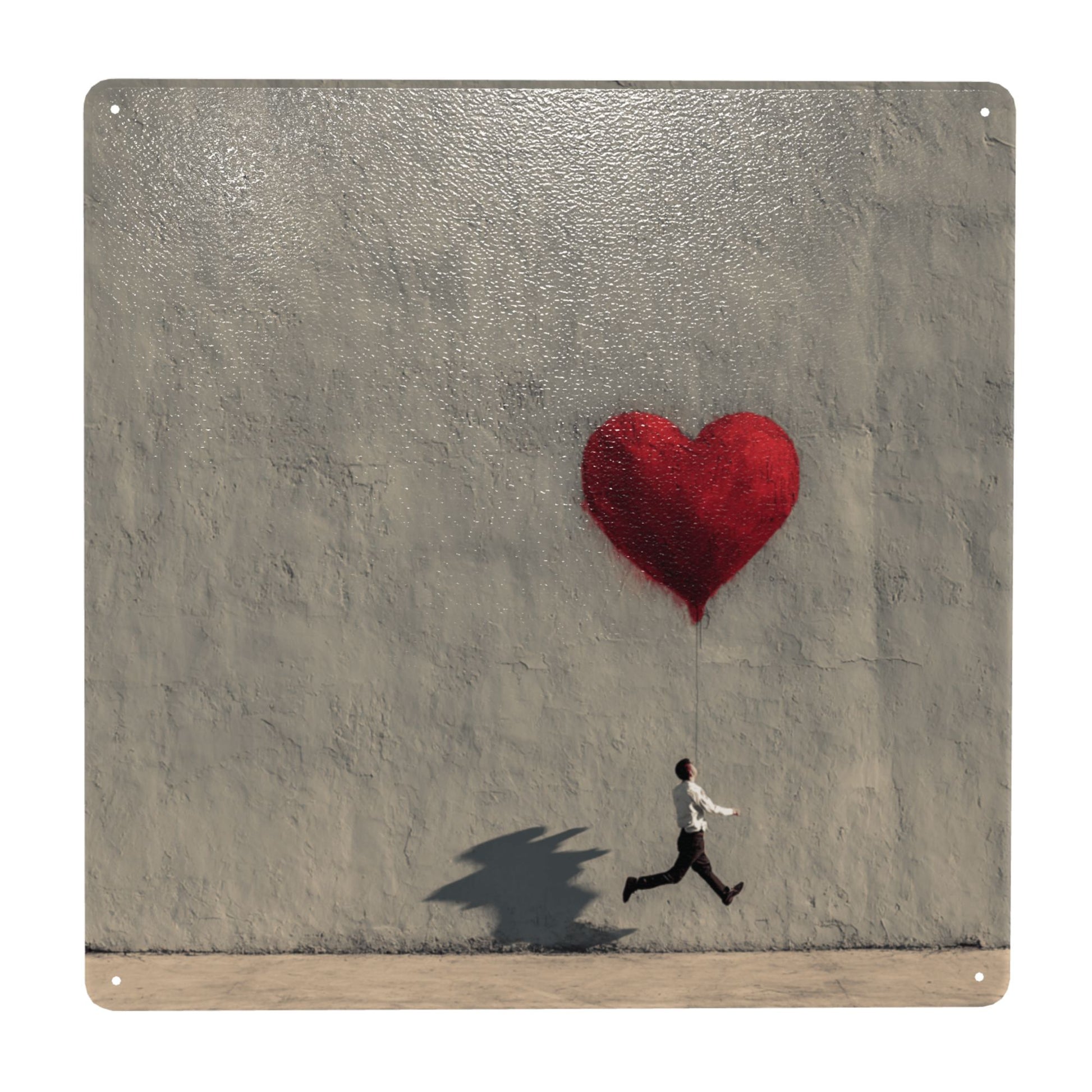 Bring movement and metaphor into your space with this evocative 12"x12" tinplate wall art. The design features a man mid-run, his hand grasping a string that lifts a large, vibrant red heart-shaped balloon above him. Set against a textured gray wall, the contrast between the neutral background and the bold red heart creates a powerful emotional focal point.
