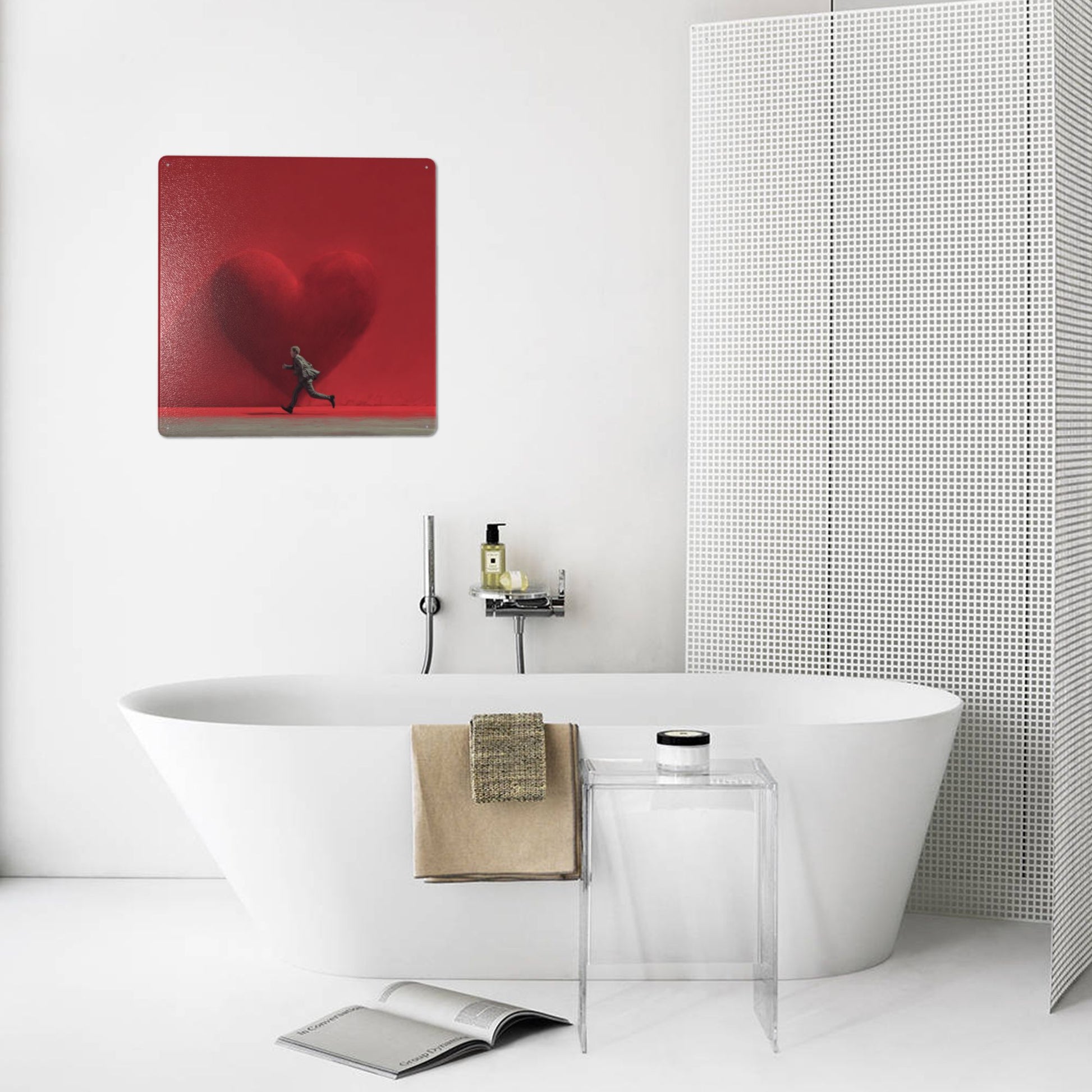 This 12"x12" tinplate wall art fuses bold minimalism with emotional storytelling. Set against a vibrant red backdrop, the piece showcases a sharply defined heart-shaped shadow — massive, textured, and dominating — with a lone figure in motion: a man in a suit running forward beneath its weighty presence.